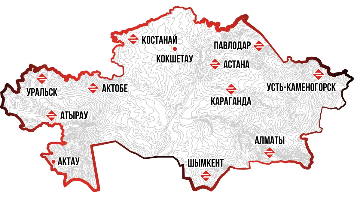 Мы работаем в 10 городах Казахстана и сотрудничаем с двумя дилерами, обеспечивая быструю доставку и доступность продукции по всей стране.