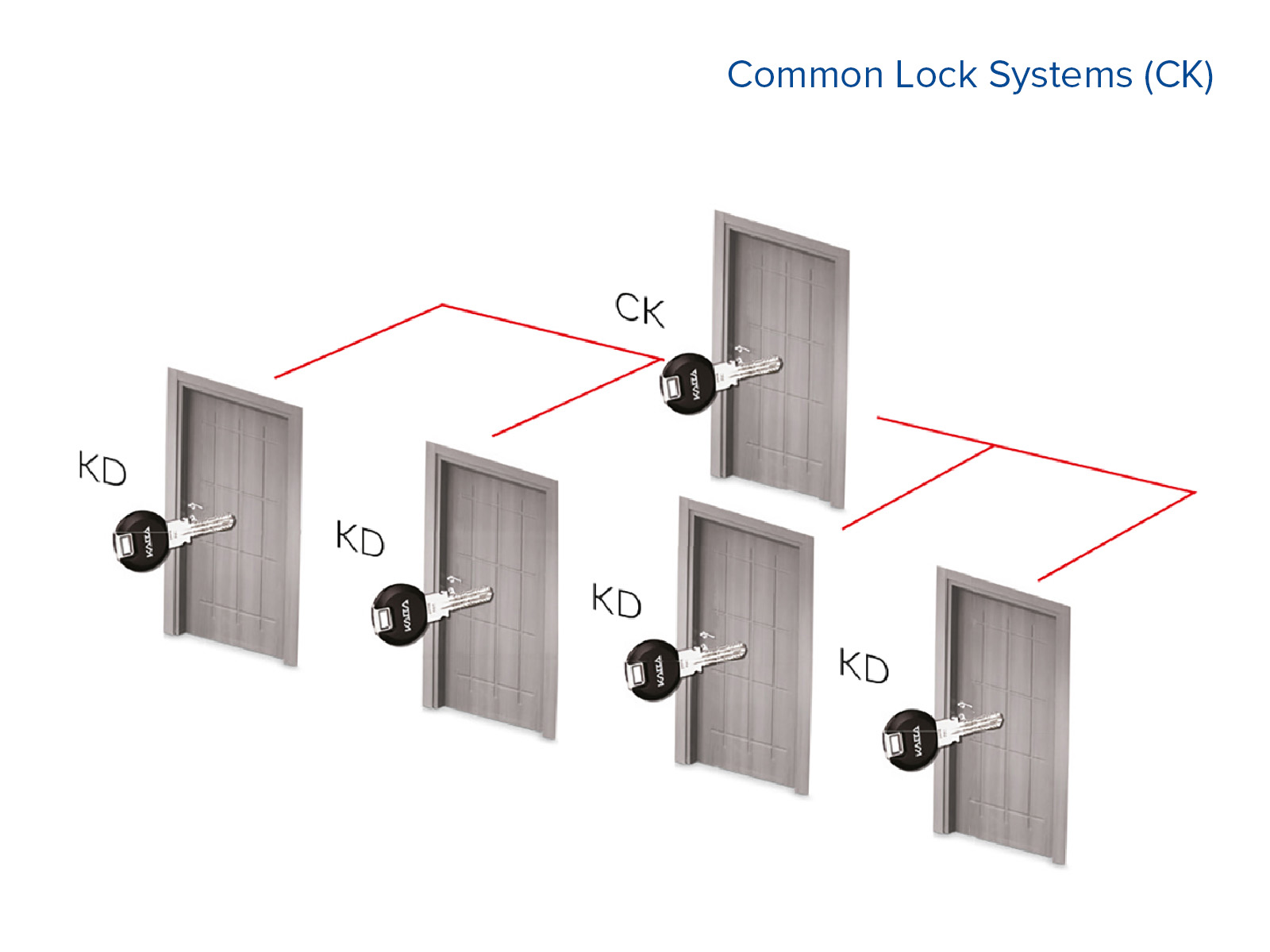 | Система с центральным замком (CK) Каждый ключ открывает свой собственный цилиндровый механиз и тот, что установлен на центральном входе (например, на входной двери в здание). |