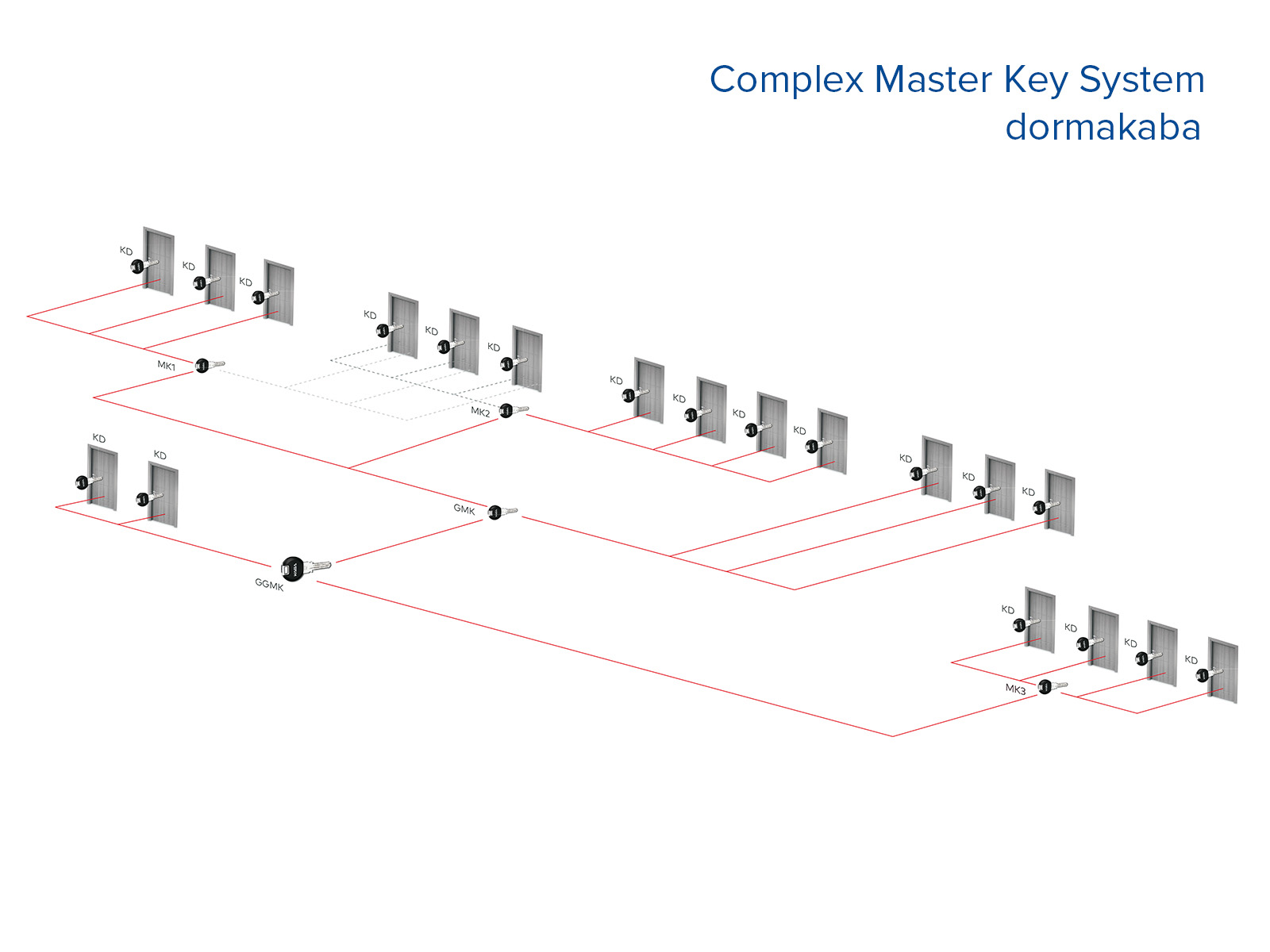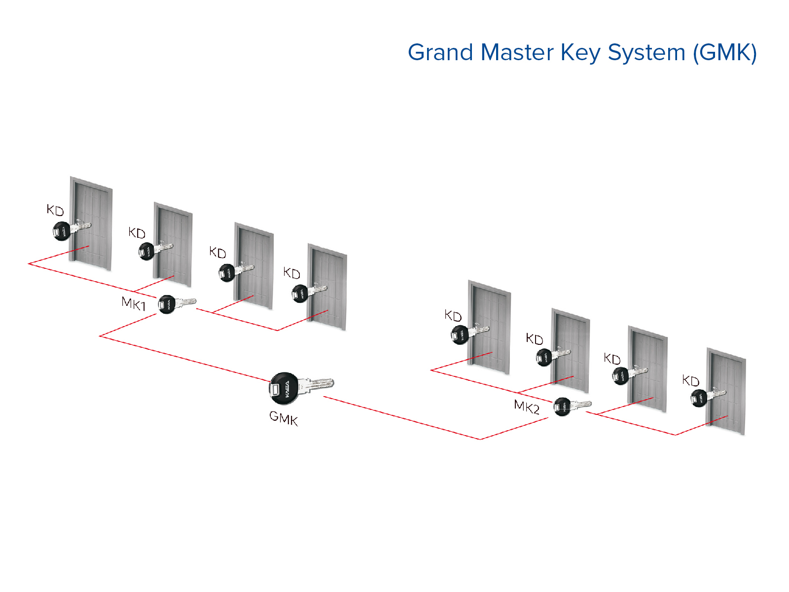 | Двухуровневая мастер-система (GMK) Каждый цилиндровый механизм системы может быть открыт собственным ключом, групповым ключом и мастер-ключом. |