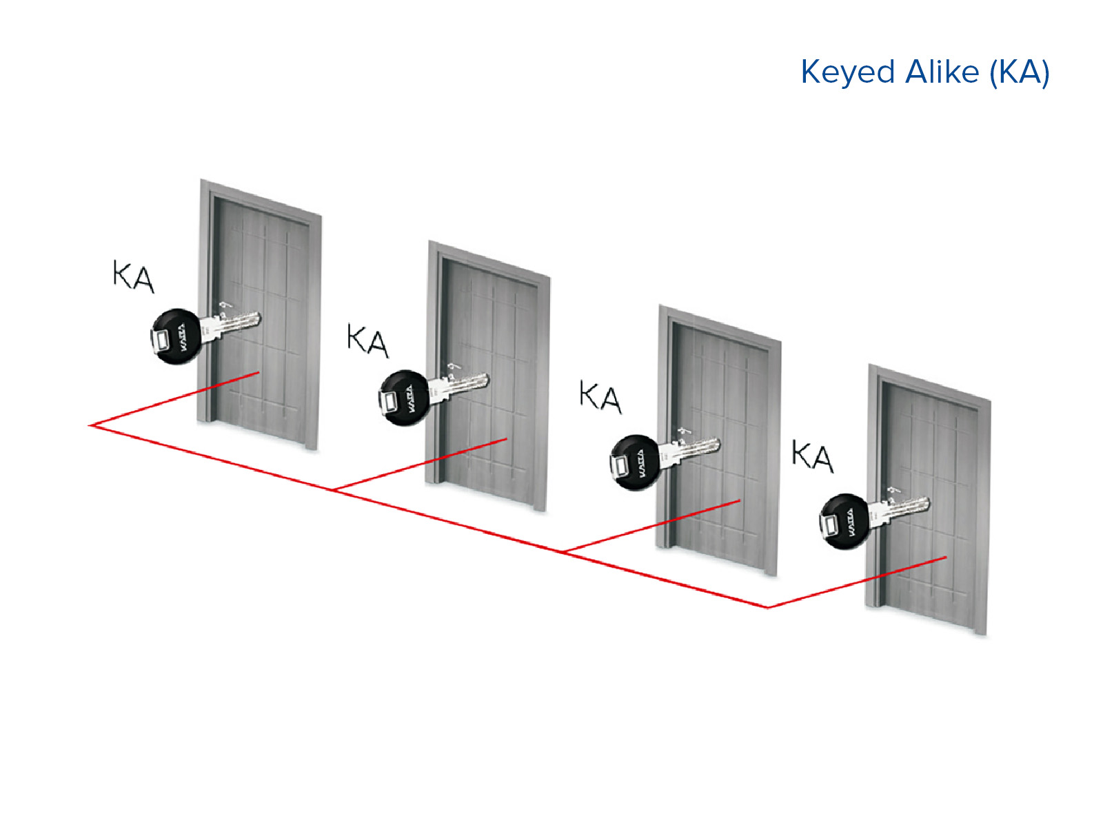 | Все ключи одинаковы (Key Alike или KA) Все цилиндровые механизмы имеют один и тот же секретный код и могут быть открыты одним ключом. |