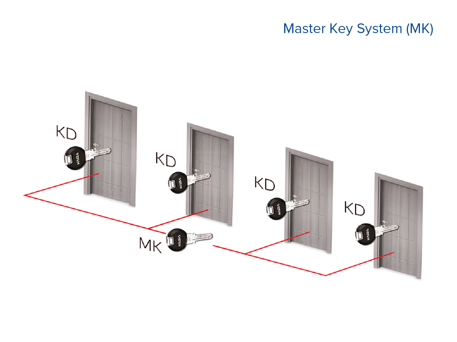 | Система с мастер-ключом (MK) Каждый цилиндровый механизм системы может быть открыт собственным ключом и общим мастер ключом. |